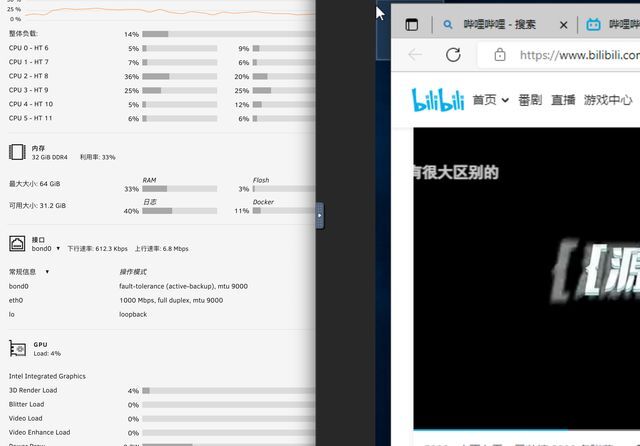 在 WIN10 里播放 B 站视频,CPU 和 GPU 都不会压力很大,但是分辨率也不高,外面 UNRAID 也没啥压力,主要是我没外接显示设备,也没声音。对于我来说仅仅是测试一下这个功能行不行,win10 可能使用率不高,最多是迅雷、百度云,或者一些 exe 程序的测试。