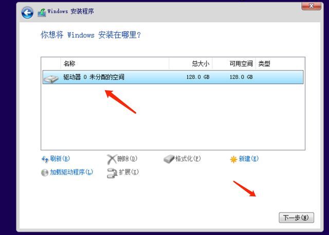 然后就可以看到分配的 128 G 驱动器了,点击下一步。