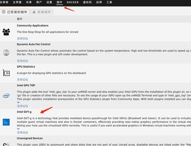 安装好了后,在 UNRAID-插件里找到 intel-gvt-g,点击。