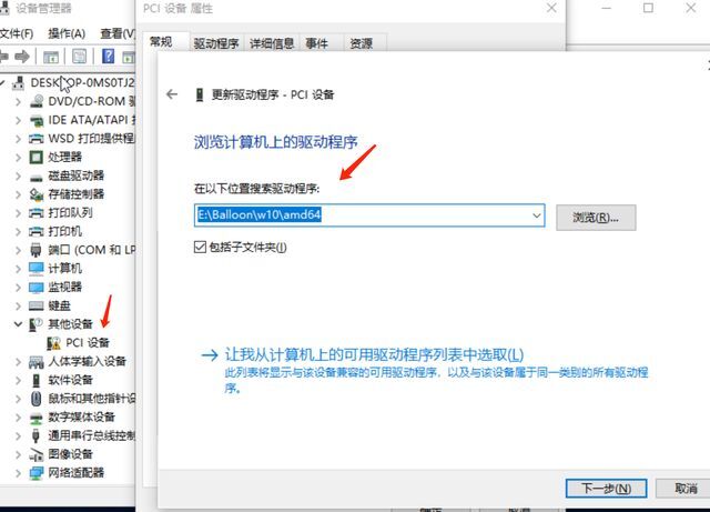 PCI 设备的驱动在 E:\Balloon\w10\amd64。