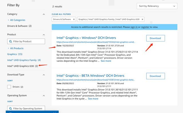 QSRL 是 UHD630 显卡,所以这里找到对应的 630 显卡驱动,最新的日期,点击下载。
