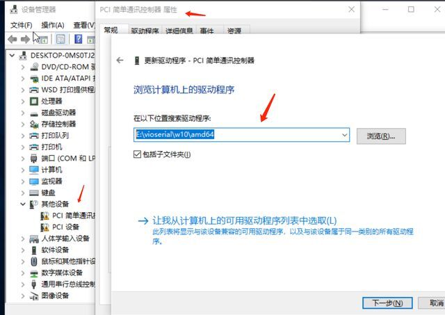 继续安装 PCI 简单通讯器的驱动程序,在 E:\vioserial\w10\amd64。