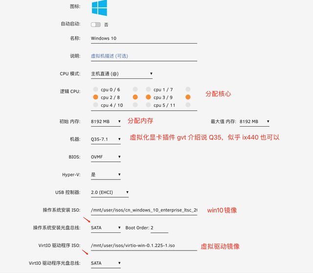 如图设置,核心视情况而定,我分配 4 个,内存有 32G,分配了 8G,机器选择 Q35,intel-gvt-g 介绍里写的,似乎 ix440 也可以,为的是之后的虚拟化核显设置,然后选择 win10 镜像和驱动镜像,总线都选 SATA。