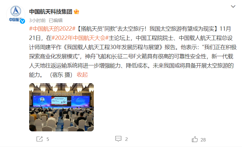 此外,周建平称“我们正在积极探索商业化发展模式”,神舟飞船和长征二号 F 火箭具有很高的可靠性安全性,新一代载人天地往返运输系统将进一步增强能力、降低成本。未来我国或将具备开展太空旅游的能力。