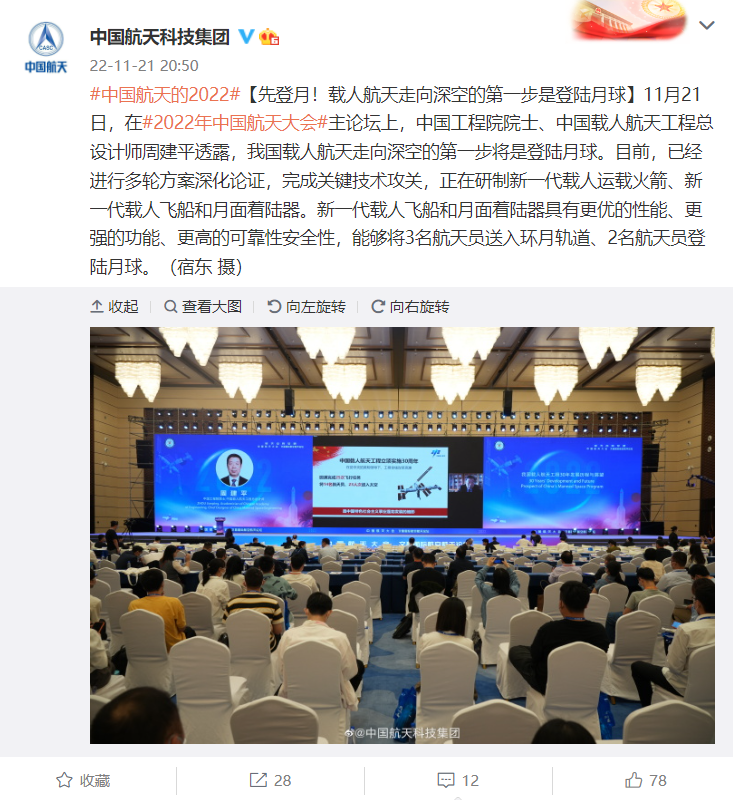 IT之家 11 月 21 日消息,据中国航天科技集团消息,在 2022 年中国航天大会主论坛上,中国工程院院士、中国载人航天工程总设计师周建平透露,我国载人航天走向深空的第一步将是登陆月球。
