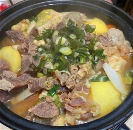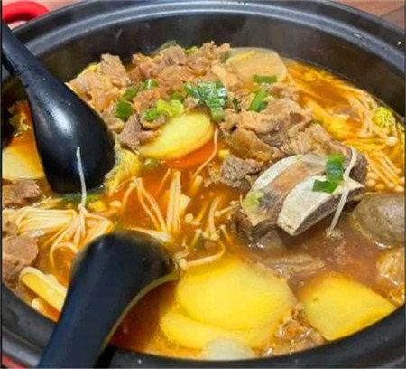 牛肉锅,那么这咕嘟嘟冒着热气,又飘香四溢的炖火锅,里面有土豆、白菜、金针菇、白萝卜片,牛肉已经很酥烂,就连锅底的萝卜和土豆,都入味。