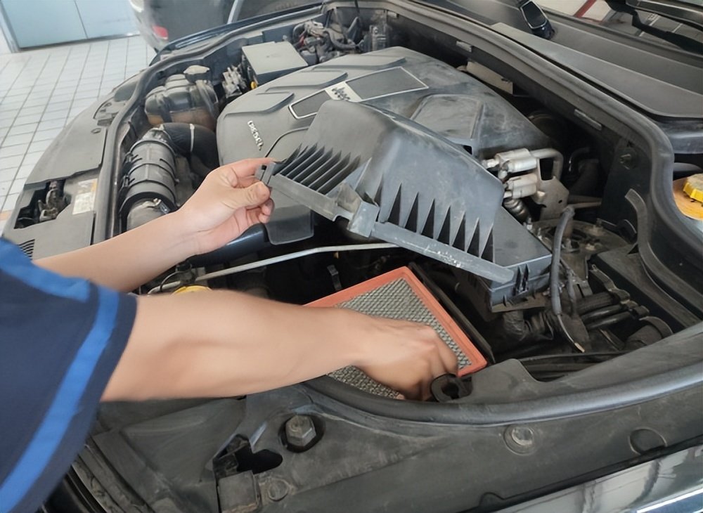 师傅拆下空气格,更换一个新的,同时先插上更换刹车油的管子,现在的专业设备更换刹车油还是蛮方便的