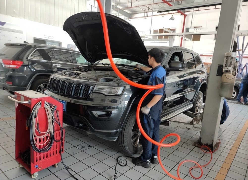 师傅在分别添加新的前后桥油,和分动箱油