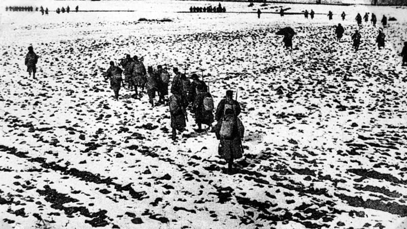 图为1942年2月,转战在冰天雪地中的抗日联军。东北的冬天,天寒地冻,气候十分恶劣。在这样艰苦的环境里,抗联战士仍旧昂扬前进,四处转战,坚持抗日。