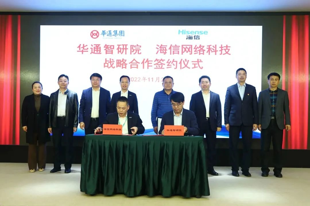 华通智研院董事长苏青林、海信网络科技公司总裁张四海在签约仪式上代表双方签约,华通集团党委书记、董事长王永亮,华通集团党委副书记、总经理张伟,海信集团党委书记、副董事长、总裁贾少谦,海信集团高级副总裁、海信网络科技董事长陈维强等相关领导出席仪式并见证签约。