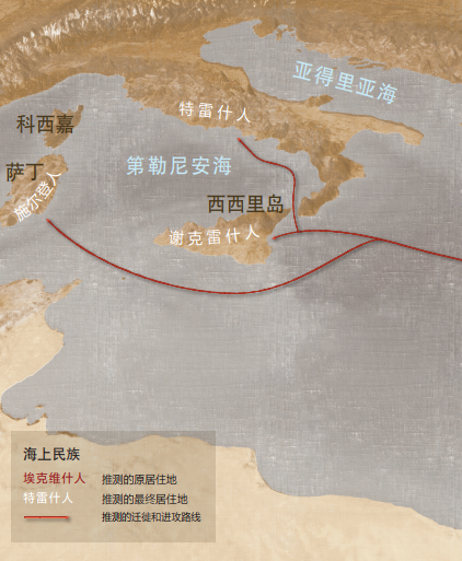 在埃及的古代文献中提到了曾经对本国造成威胁的九大民族,并指责他们是公元前 1200 年发生在近东的大部分破坏活动的始作俑者。在法老拉美西斯三世( Ramsès Ⅲ)和麦伦普塔( Mérenptah)统治时期,海上民族完成了两次大的迁徙,给近东地区造成了无法估量的破坏。