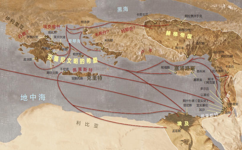 正如公元前 18 世纪的马里王室( Mari)档案所述,像乌加里特( Ougarit)和比布鲁斯( Byblos)这样的城市曾是重要的商业中心。各王国之间的关系也在和平共处和兵戎相见之间反反复复。由于各国的争斗也常常只是出于夺取边境村庄、耕地和水源的控制权的目的,其规模极其有限,对当地的政治平衡并没有造成不可逆的影响。但到了公元前 1200 年,近东的地缘政治经历了根本性的改变。