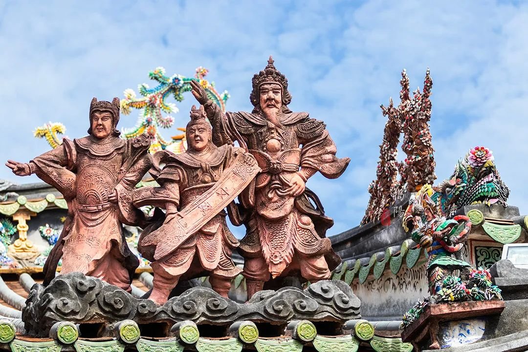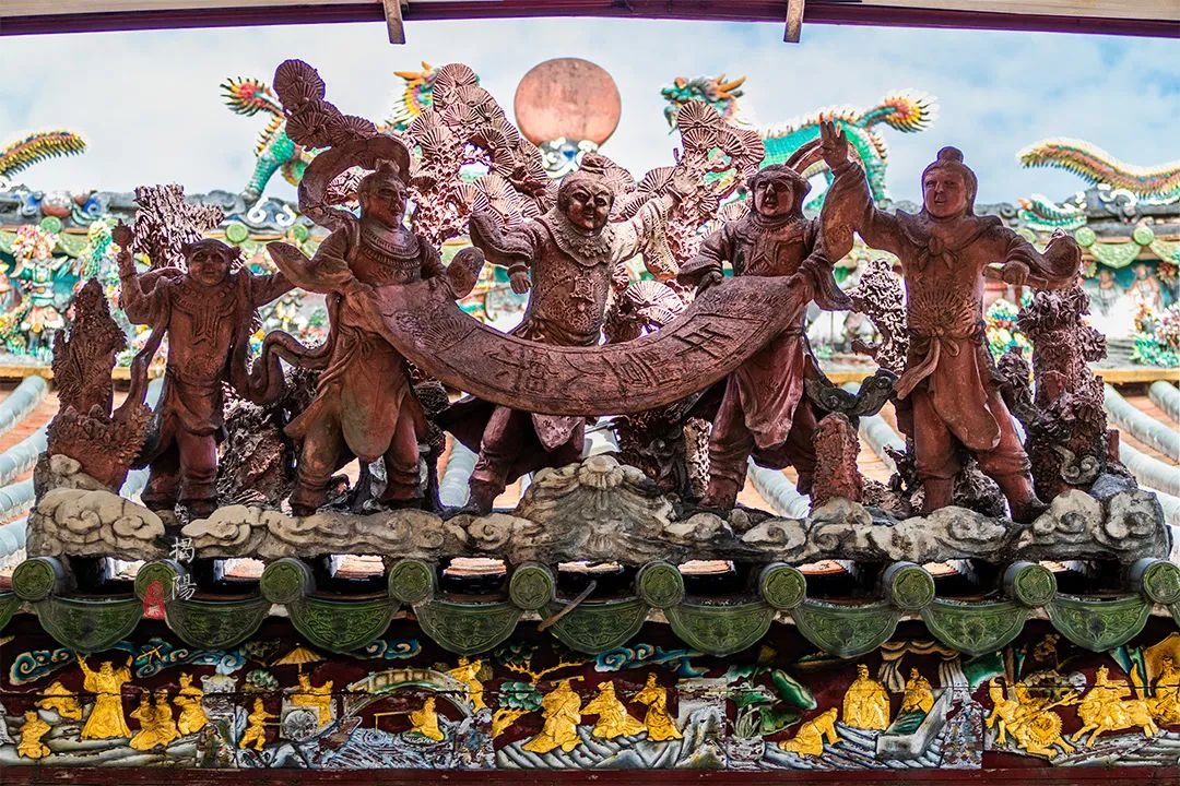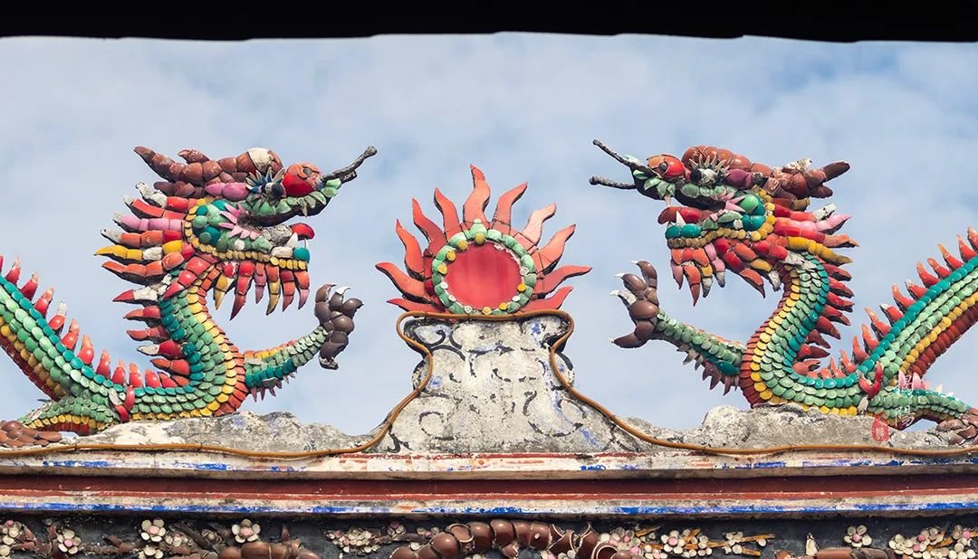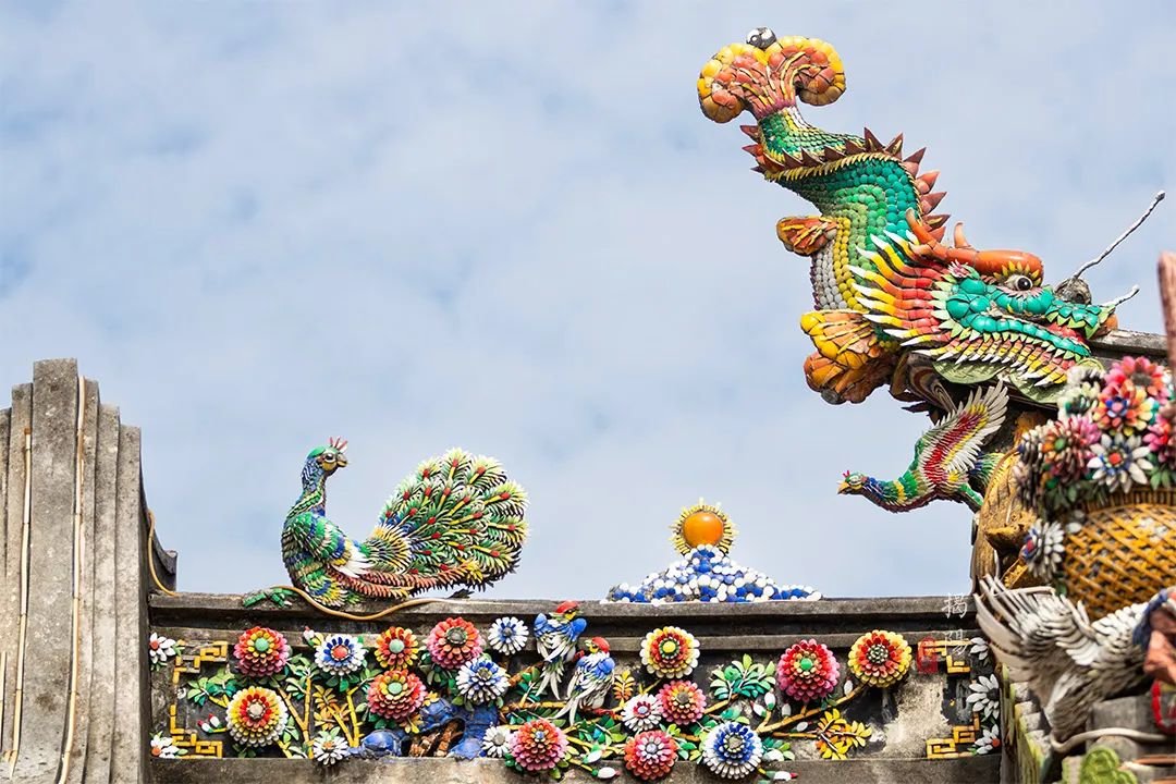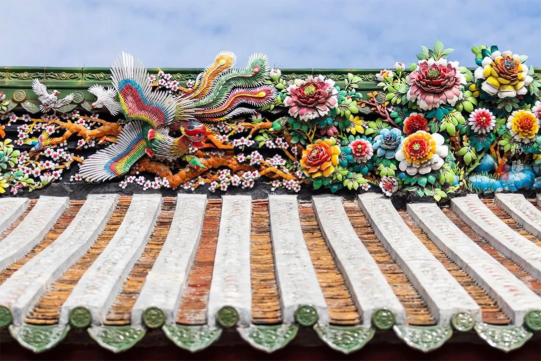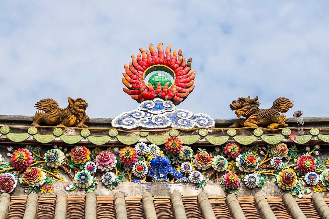 看到屋脊了吗?这是嵌瓷,广东潮汕地区三大传统建筑装饰艺术之一。以绘画为基础,运用各种彩色瓷片,剪裁出表现形象的建筑装饰,被誉为“永远亮丽的艺术”。