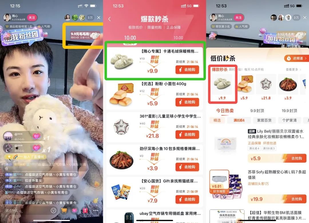 在双十一活动开始时,达人在直播间通过口播和动作,引导用户点击右上角直播间指示器,进入秒杀频道。而利达妮的小羊棉拖就在这个界面的置顶位置,且带达人专属字样精准承接。