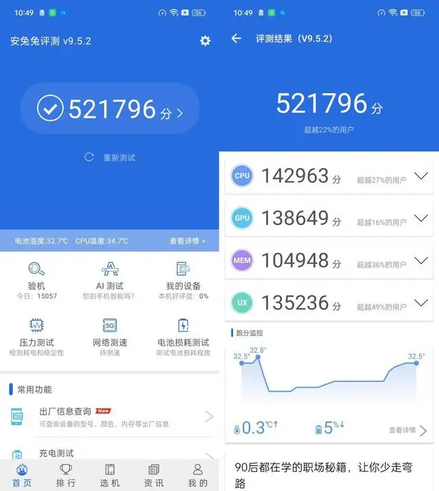 紧接着说一下重头戏,那就是两者的性能。荣耀 X40搭载了采用台积电6nm工艺打造的骁龙695处理器,搭载这款处理器的荣耀 X40在安兔兔上可以跑到42万分,这个分数在同价位手机中只能说是中规中矩。而真我10 Pro+就不同了,采用了天玑1080处理器,尽管也是台积电6nm工艺,但在性能上还是要比荣耀 X40好上不少。同样是安兔兔,真我10 Pro+的跑分可以达到52万分,有着明显的性能差距。