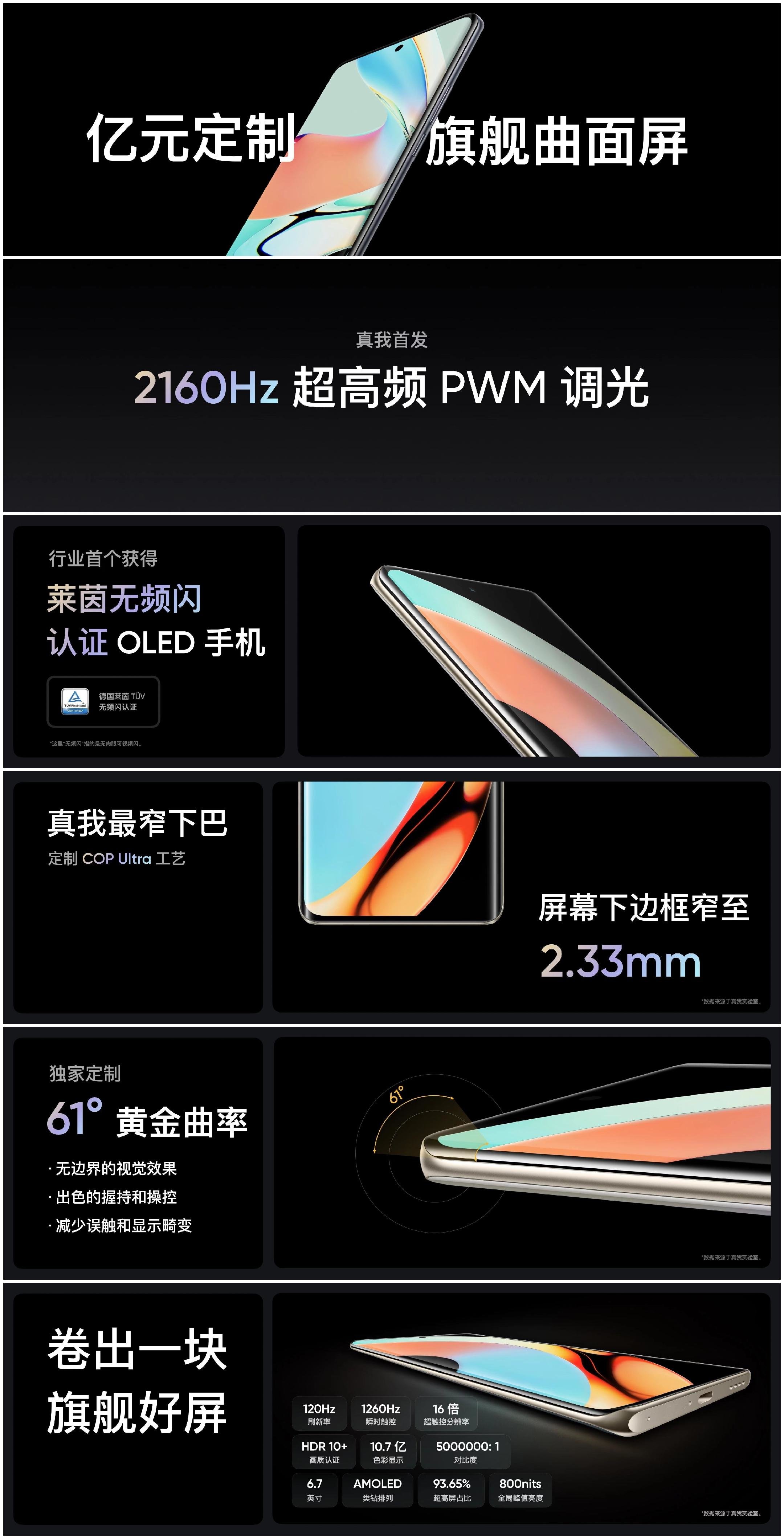 首先是在屏幕方面,在这方面,这两款手机可以说十分相似,那就是均采用了OLED曲面屏幕,且都支持120Hz高刷。曲面屏手机能够在用户日常使用、观影的时候带来更好观看感受,这两款手机也不例外。不过真我10 Pro+的表现则更加突出,它的下边框仅有2.33mm,是真我最窄的下边框。极窄的下边框带来更高的屏占比,自然也让用户有了更好的使用体验。