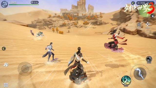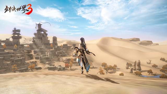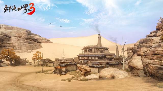 这次《剑侠世界3》更新的一大亮点就是龙门荒漠地图,可以说质感满满。利用前沿3D引擎,完美还原了中国著名景点洛阳龙门及其周边地貌。还有经典影视人文场景,像龙门客栈、千佛窟,也被复现到了游戏之中,搭配游戏的实时天气系统,可谓是既能够欣赏到“大漠孤烟直”的诗意风景,又能体会带有满满武侠元素的人文景观。