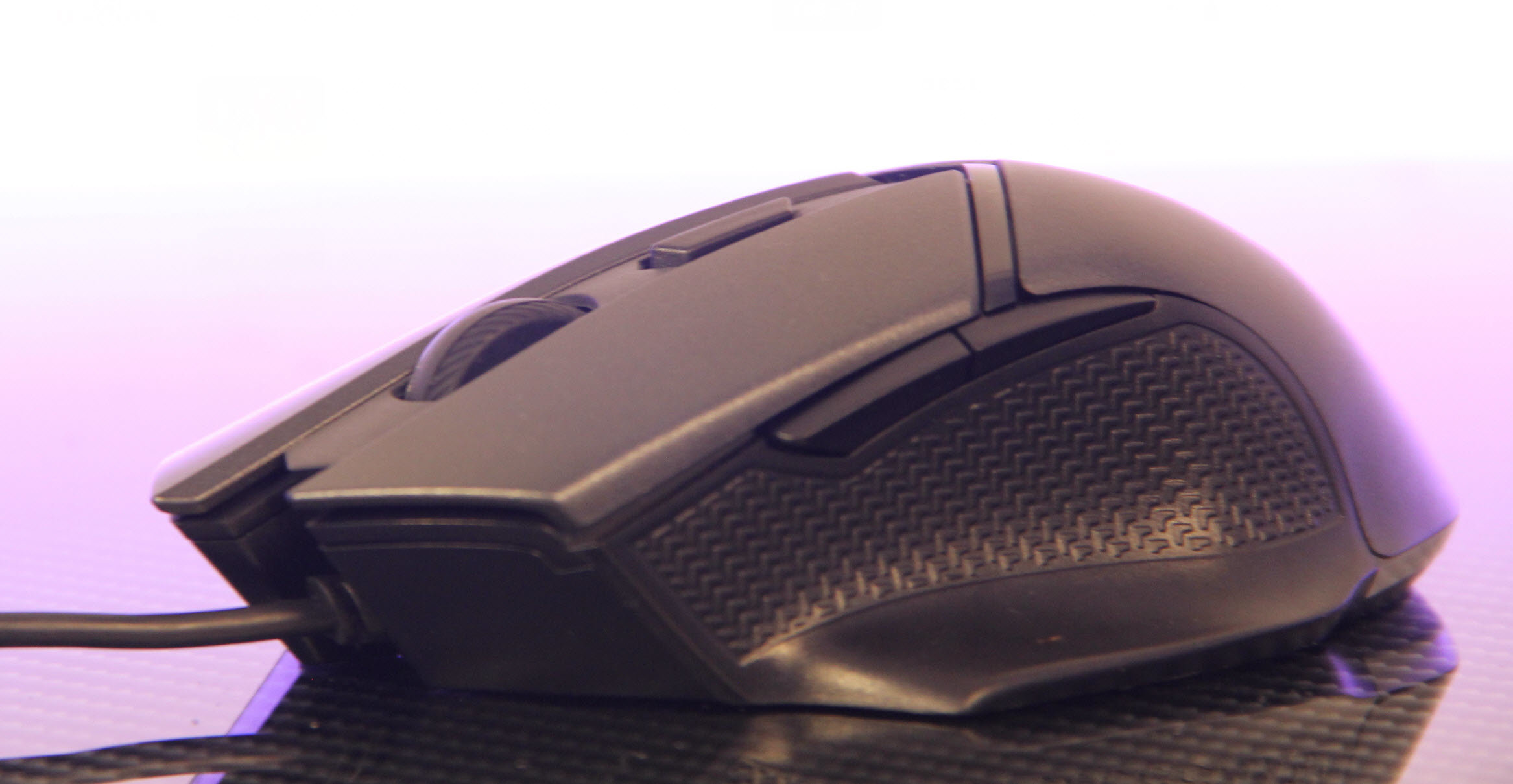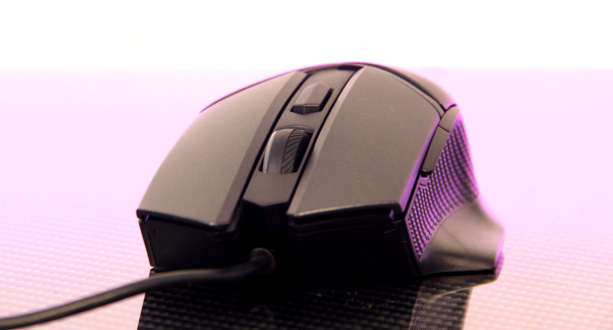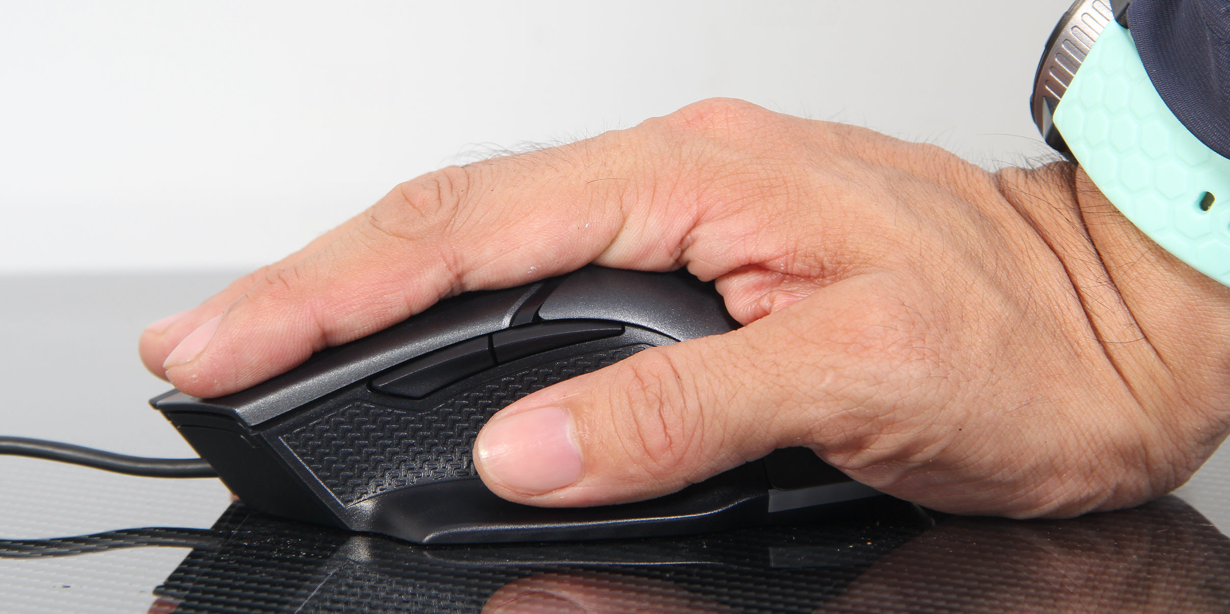 它的大弓面采用磨砂工艺,而在侧握处则是带防滑纹路的橡胶垫,从而大大提升鼠标握持稳定性。左侧提供了两枚侧功能键,贴合大拇指弧度,实现快速动作的同时也能避免出现误触。