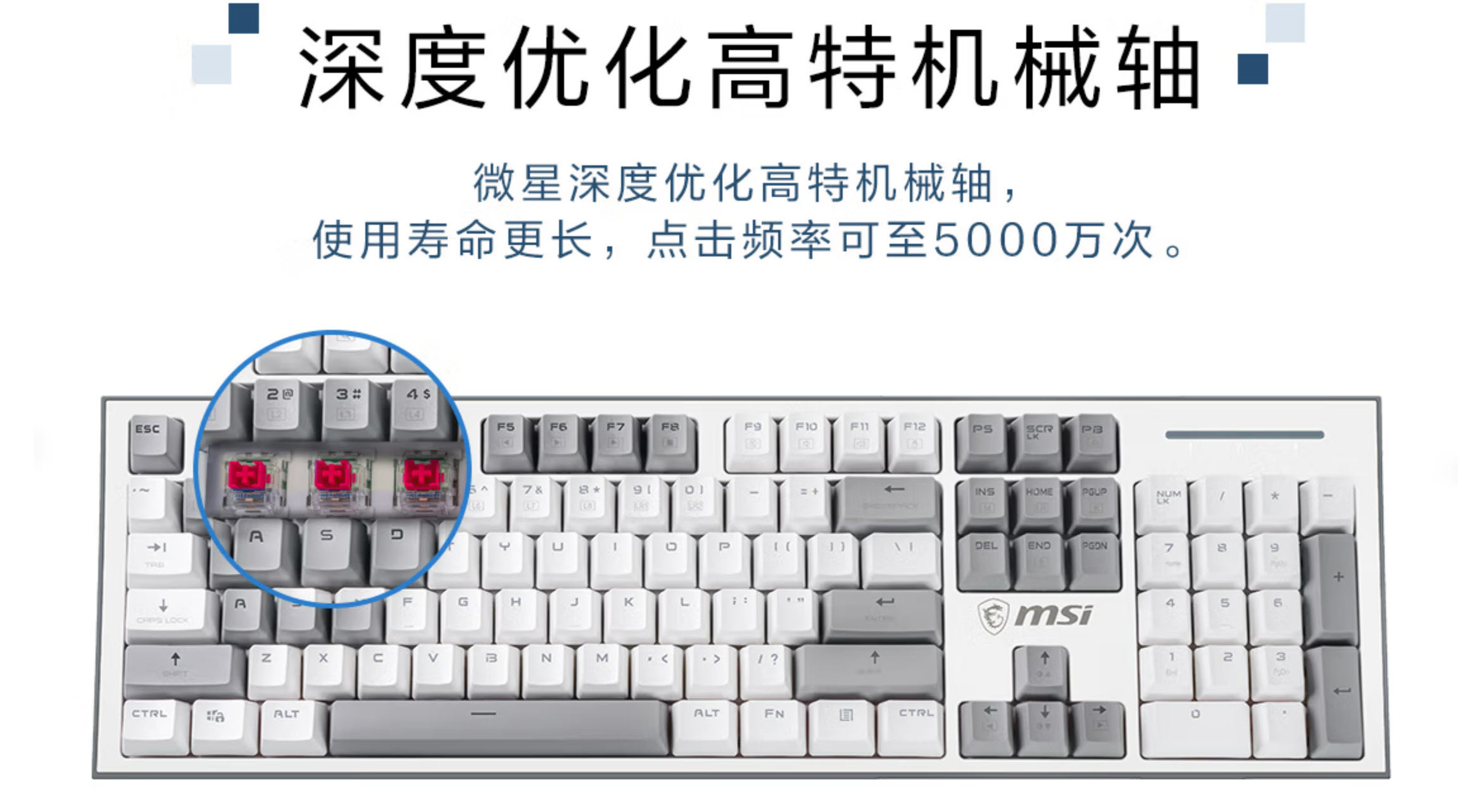 微星GK50Z Pixel 40度灰之所以堪称入门级之王,正是因为这款键盘特价刚过百元选用的是定制版高特红轴,玩家对这个轴的评价相当高,比樱桃轴轻键程也短些。对我们而言更是立下汗马功劳的,把樱桃轴打下神坛的就是这些威武的国产轴。这款微星深度优化的高特红5000万次无故障点击率,感觉无限接近樱桃轴,能带来更好的使用体验。