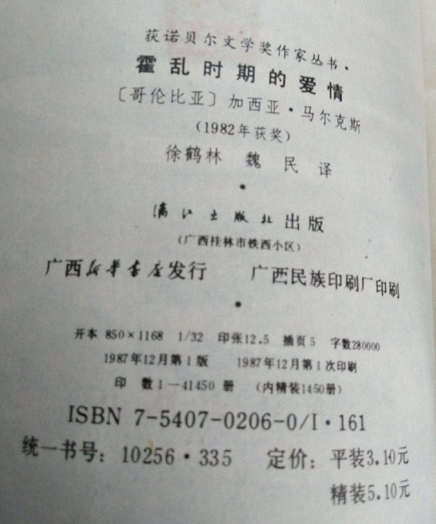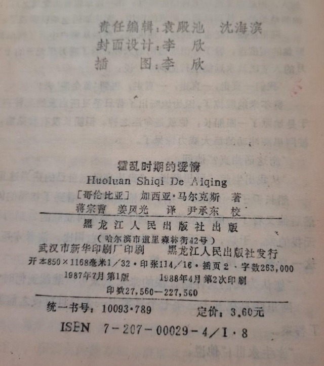 在当年未经授权的《霍乱时期的爱情》翻译热潮中,第一版本是黑龙江人民出版社出版的版本,出版时间在1987年7月。