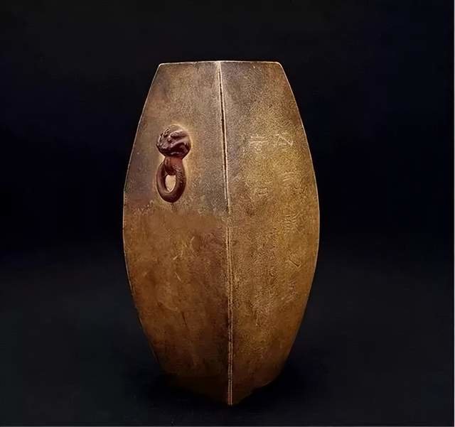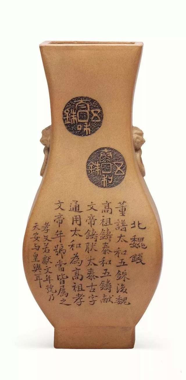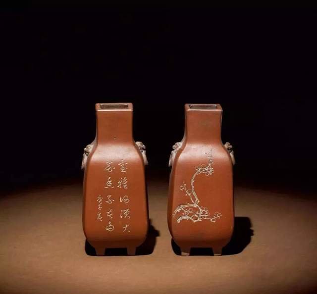 ▲韩泰 双兽耳六方诗文紫砂瓶