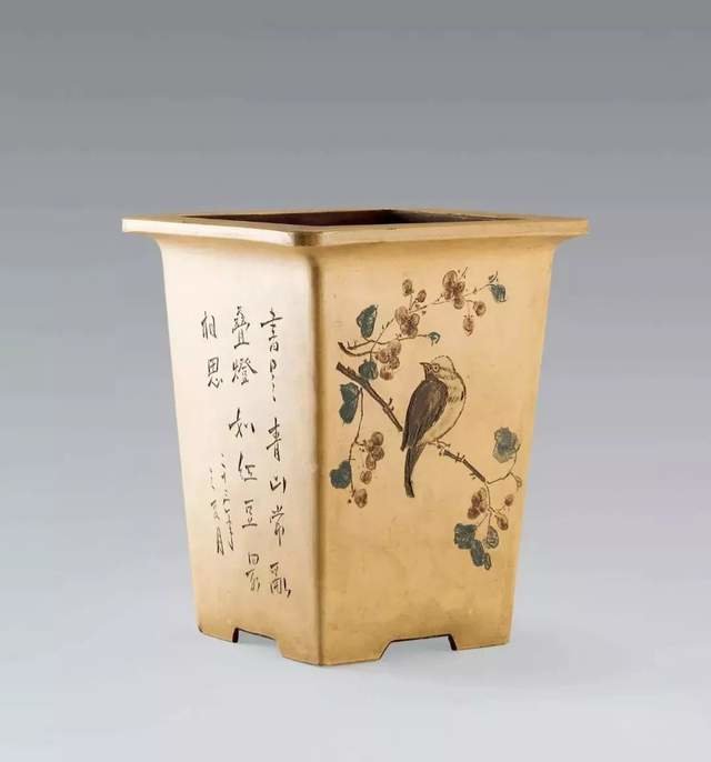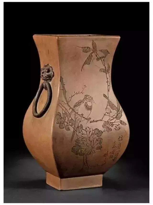 ▲潜陶刻 段泥刻花鸟诗文方瓶