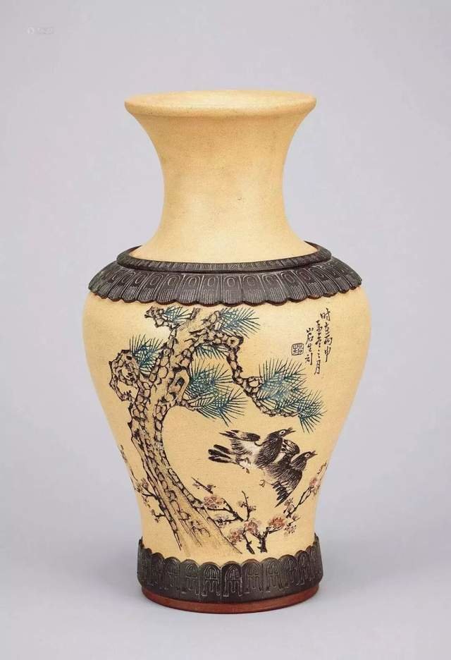 ▲花鸟图段泥巧色花瓶