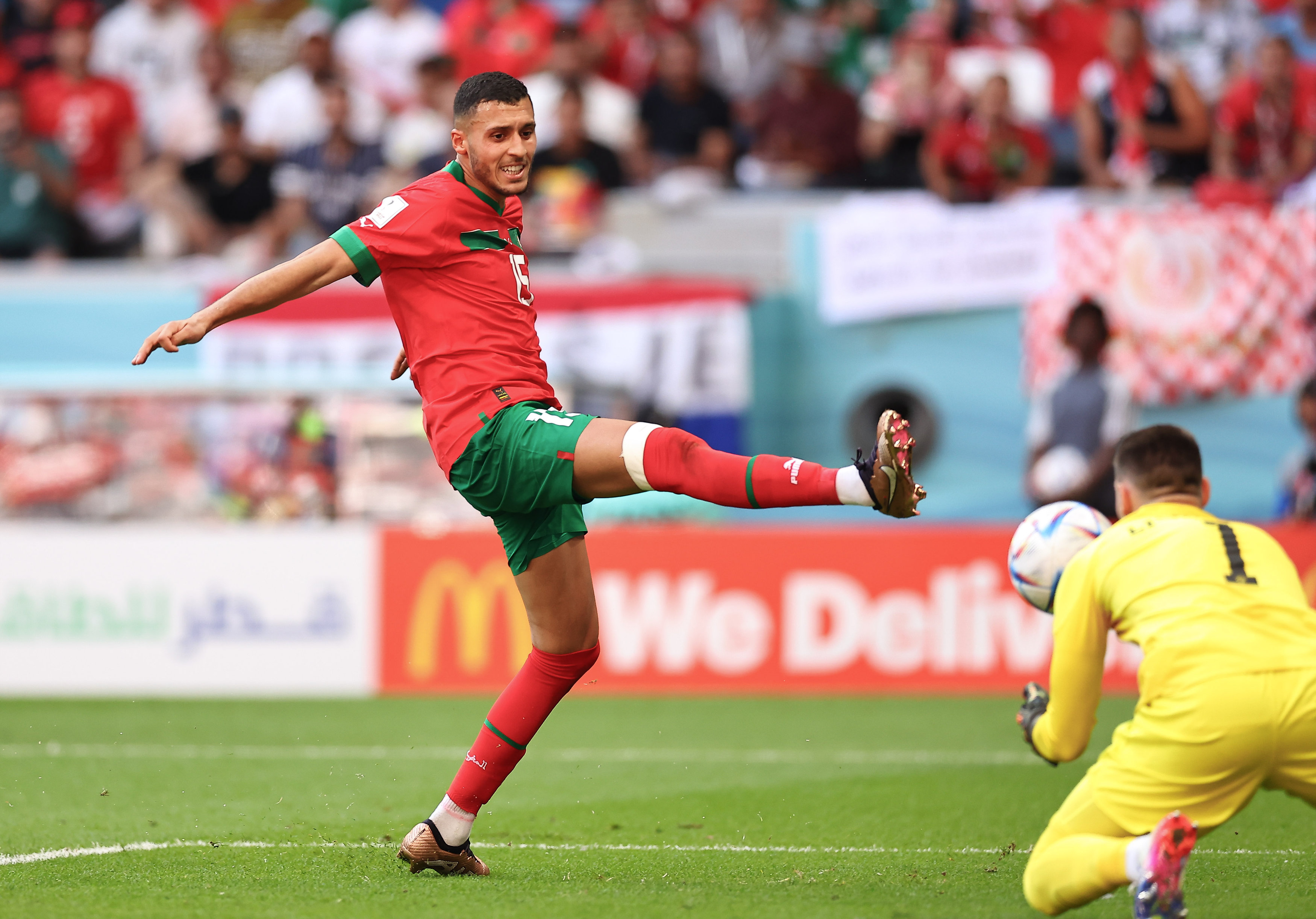 11月23日,摩洛哥队球员阿马拉(左)射门。新华社记者 丁旭 摄