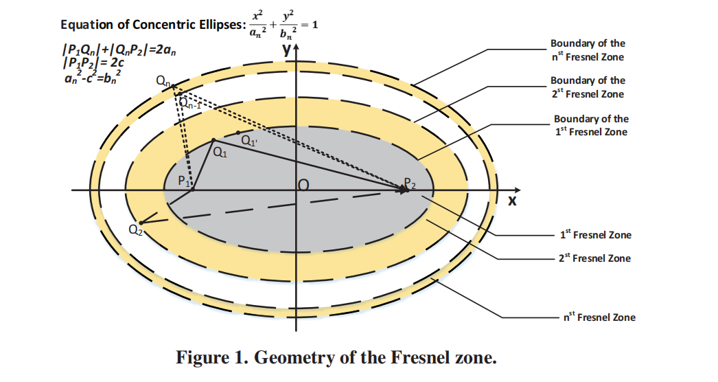 菲涅尔区模型:P1 和 P2 可看作一对无线信号的收发设备,最内层的椭圆为第一菲涅尔区