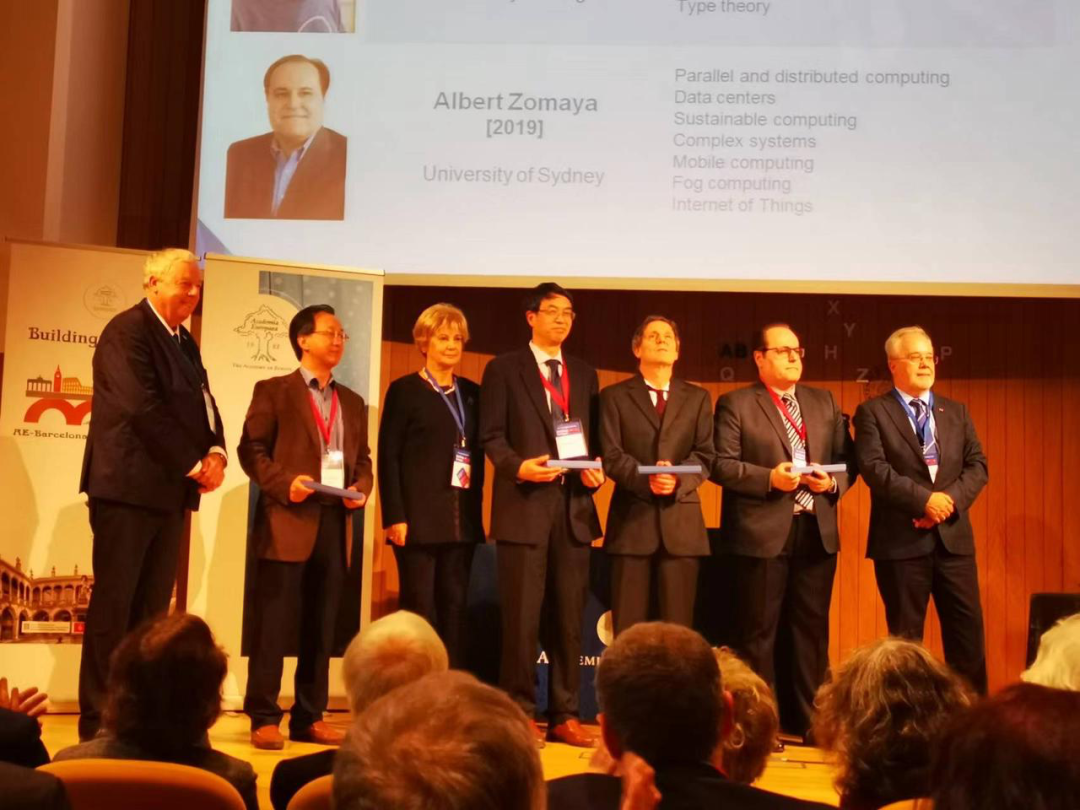 2019 年,张大庆(左二)在巴塞罗那参加欧洲科学院院士授牌仪式
