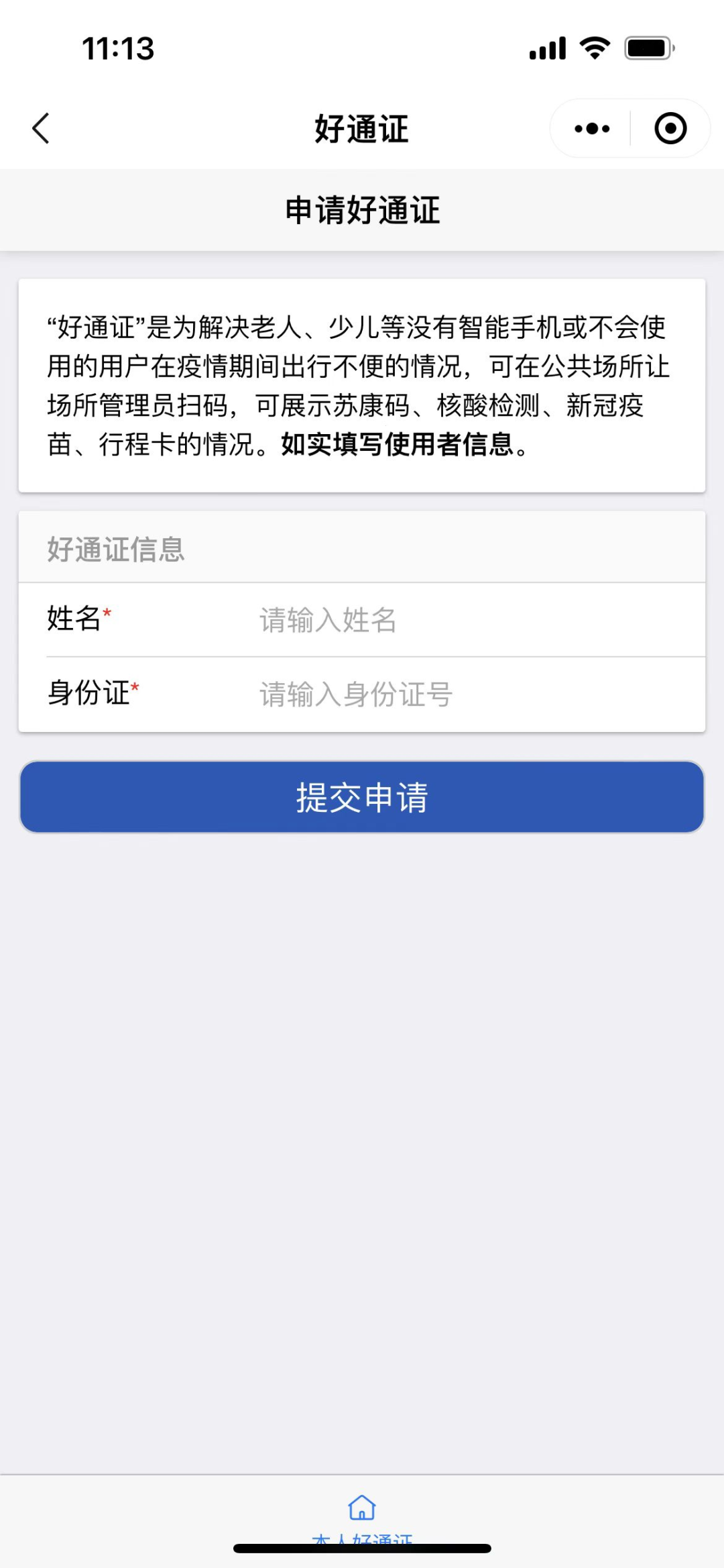 微信搜索“好通码”小程序,点击首页“好通证申请”,输入姓名、身份证号、手机号进行申请。