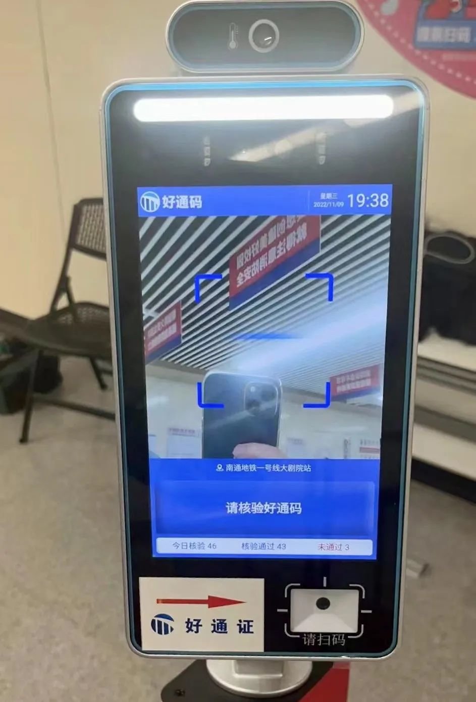 地铁站内已增设好通证自助核验设备,市民持好通证在核验机具上展码核验。其余场所均有管理员扫码核验。