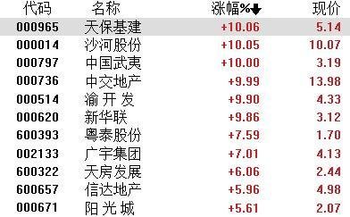 A股房地产开发板块开盘活跃,截至发稿,$中交地产(000736)涨停,$沙河股份(000014)、$南国置业(002305)、$金地集团(600383)、$天房发展(600322)、$天地源(600665)等股拉升跟涨。