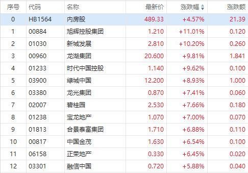 港股市场中,内房股暴涨,融创服务涨17%,旭辉控股涨14%,时代中国、龙湖集团、新城发展等涨超10%,碧桂园涨9%。