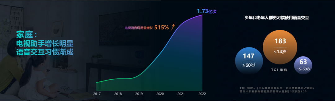 在家庭场景,电视助手语音调用量过去3年间,增长了515%。在用户分析中看到,全年龄段用户都已形成语音交互的习惯,其中低于14岁的少年儿童群体和高于60岁的中老年群体比成年用户更偏爱语音交互。