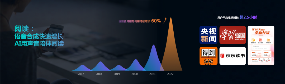 在阅读场景,一些大型新闻类、阅读类APP的应用,让语音合成服务的调用量有了明显增长。在AI的加持下,用声音陪伴的阅读体验,正在改变用户的阅读习惯,提升阅读粘性。