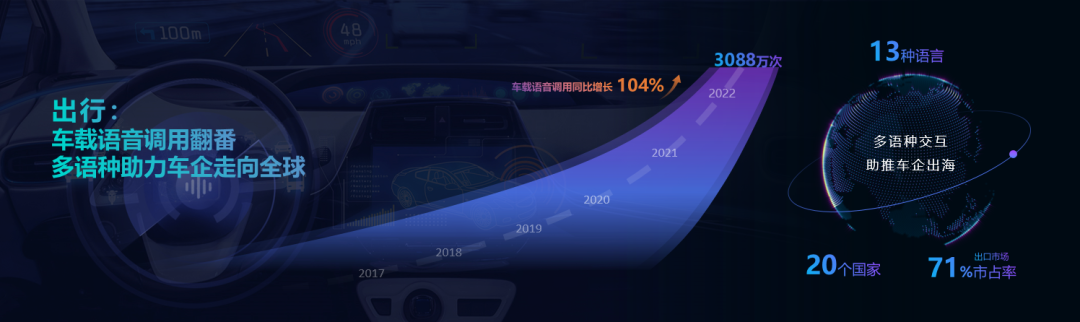 在出行场景,车载语音调用量获得到了翻番的增长。在过去一年全国出口的200万辆汽车中,预制讯飞多语种语音交互系统的车辆已超71%。合作车企在科大讯飞的助力下,已将13个语种推广到全球20个国家。