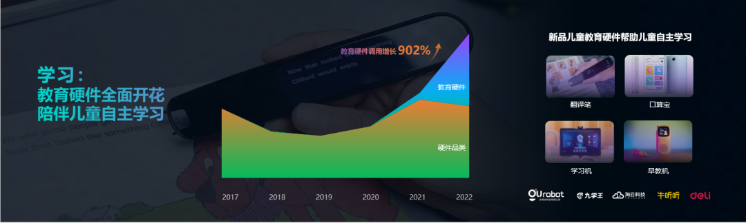 在学习场景,教育相关的AI调用增长902%。在双减政策的推动下,AI帮助学生减负。讯飞及生态伙伴推出学习机、翻译笔、口算宝、早教机等一系列智能硬件有效陪伴了少年儿童的学习成长。