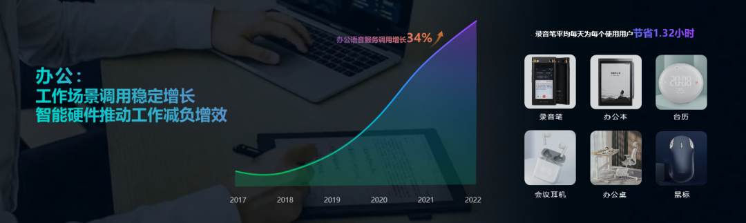 在办公场景,AI办公硬件服务调用持续快速增长。以办公本、会议耳机、翻译机为代表的办公硬件,为用户省时增效。在录音笔的应用中,平均每天为每个用户节省1.32小时。AI在办公领域的广泛应用,已为工作效率的提升发挥巨大作用。
