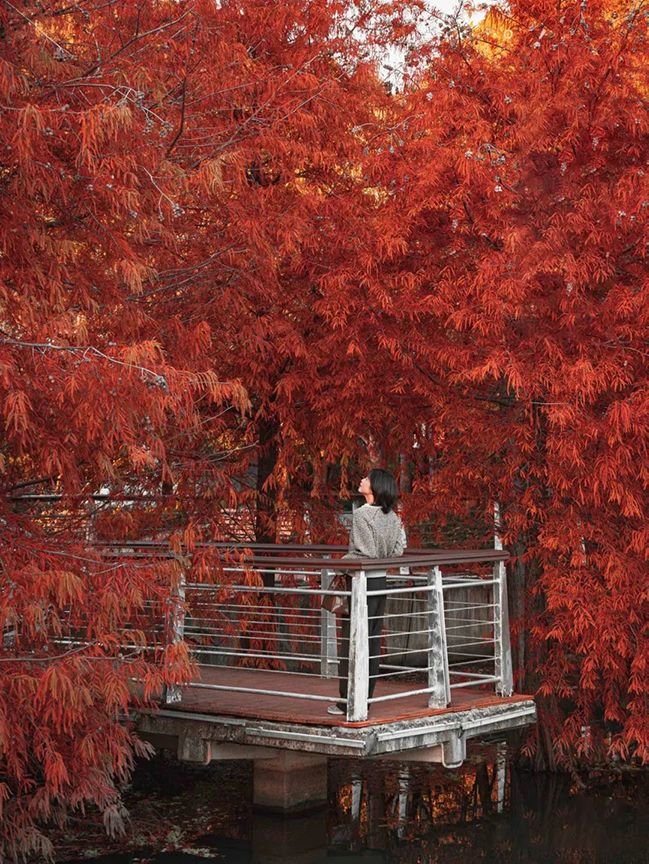 台州秋天最美的颜色是水杉的红黄色。在中央山公园,11月底正是水杉变色的高峰期,绿色几乎完全褪去,只剩大片大片金黄与火红,点缀在湖水映照的蓝天中,画出一幅醉人的秋色。