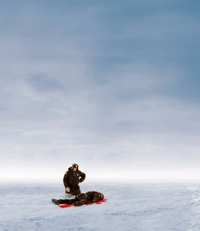 《冰血暴》中警探玛吉·冈德森(弗兰西斯·麦克多蒙德饰)在路边检查一起公路杀人案中的受害者尸体(剧情梗概图艺术家 J. 托德·安德森饰)。这部以寒冬为背景的惊悚片是科恩兄弟在家乡明尼苏达州拍摄的第一部电影。他们一定要拍摄出天地合一没有分界的效果。