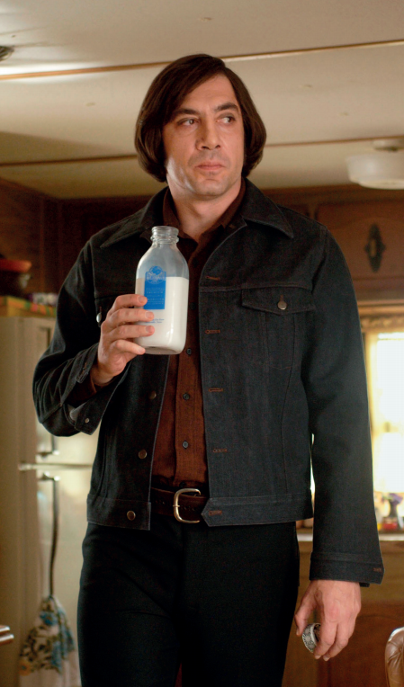 安东·奇古尔停顿片刻,喝下一杯牛奶。牛奶是影片中难以捉摸的意象:之后我们还会看到猫咪舔了一口地上洒落的牛奶,预示了不幸。这里它暗示杀手身上兼具奇怪的纯洁气质和几乎孩子气的精神病。