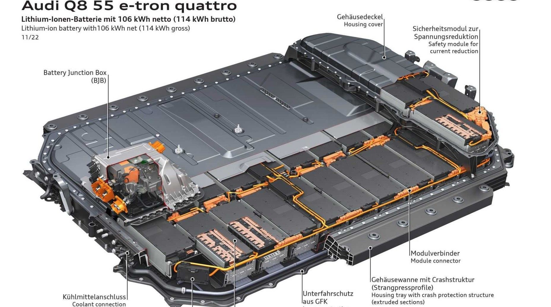 奥迪表示,已经改进了这些车型的电池技术,它们现在的能量密度比以前高出约20%。55和S型号的电池组更大,总容量为114 kWh,而50将配备较小的95 kWh电池组。前者最多可存储 104 kWh,而后者具有 89 kWh 的容量。