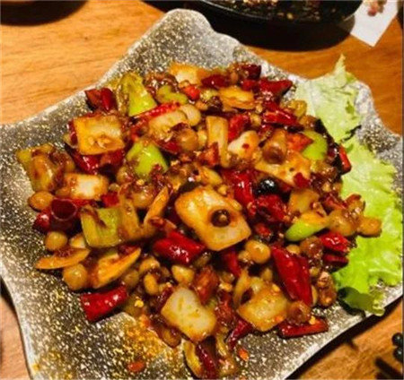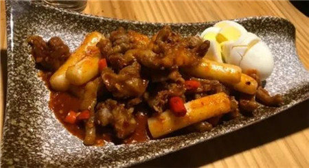 火辣鸡爪是跟年糕一起炒的,酱汁包裹着鸡爪,非常的下酒,辣度可以自行选择,还可以选酱香口 。