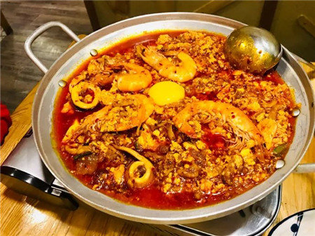能吃辣的可点鸭肠锅,锅底辣辣的。海鲜锅巴汤,清清淡淡很鲜美,天冷来一锅,又暖又舒服。