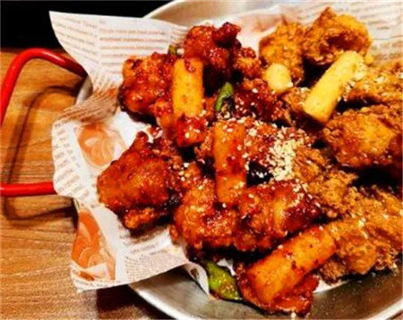 香辣鸡块,炸好的无骨鸡腿肉,金黄焦脆的表皮,裹着特别的红色酱料,口感一级棒。