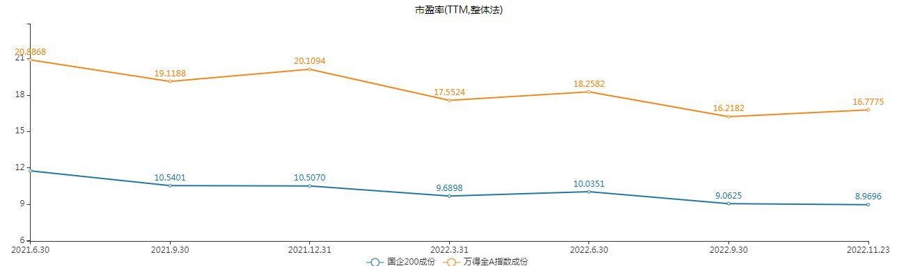 未来现金流贴现作为价值观测的方式之一,表示在既定的无风险利率水平下,未来现金流越多,理论上对应的价值与估值应当越高。但是理论是否与市场正相关,常常成为研究与投资的迷茫之处。举例,据Wind数据,以国有企业200为例,截止11月22日,市盈率为8.93倍,相比A股16倍整体市盈率,表现低于平均整体水平。国有企业200的股息率为2.73%,A股股息率为1.71%,暗含着有着相对较高的投资回报率,较低的估值却不受市场热衷。值得注意的是,国有企业作为国民经济的重要支柱,其市值总和接近A股市值的30%,其中超千亿市值公司占5成,倘若形成估值修复偏好,则权重效应将成为焦点。