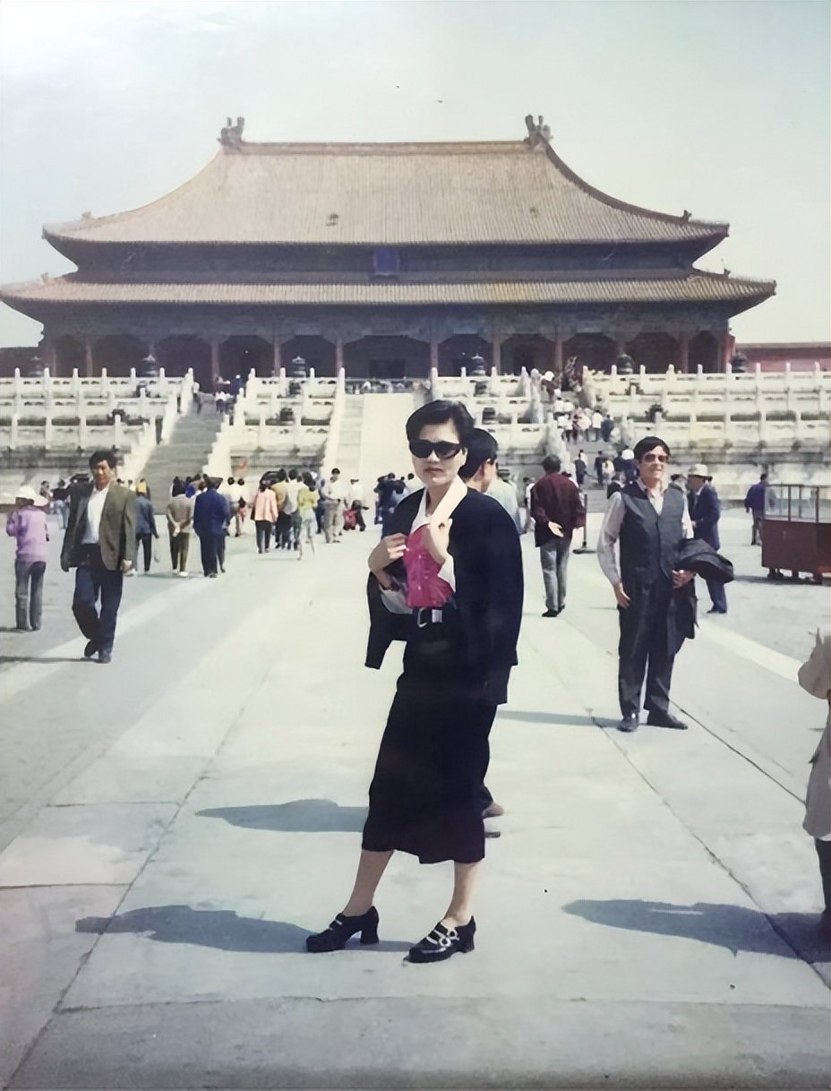 这是一张在故宫拍摄的老照片,拍摄时间为九十年代初期。从照片上看,当时游览故宫的人挺多的。照片上的女子戴着墨镜,身穿当年流行的职业套装,短发,显得很干练。满满的高级精英范儿。