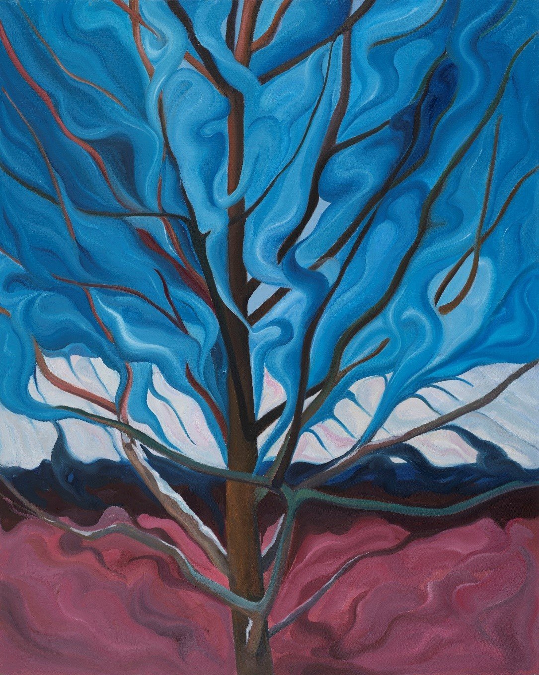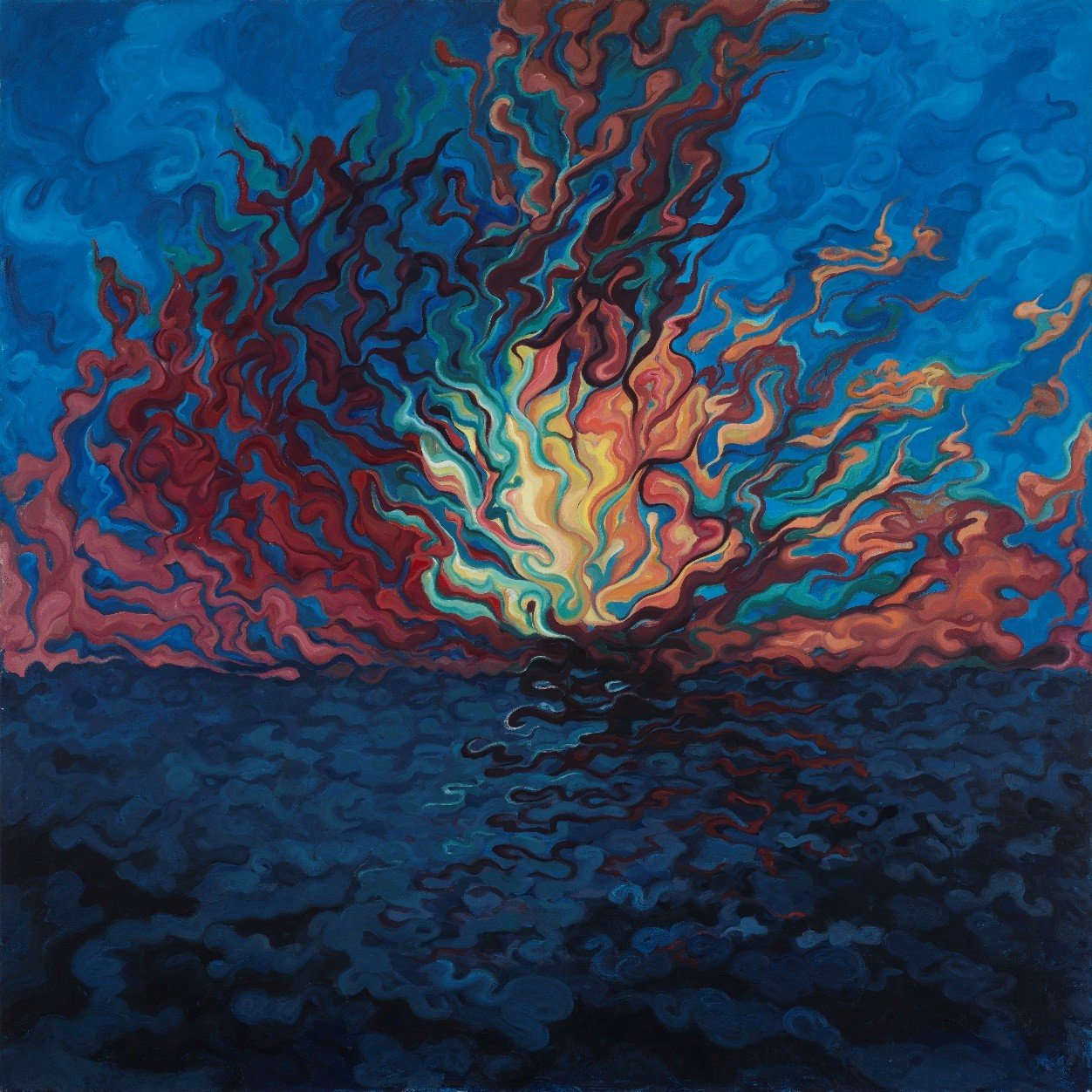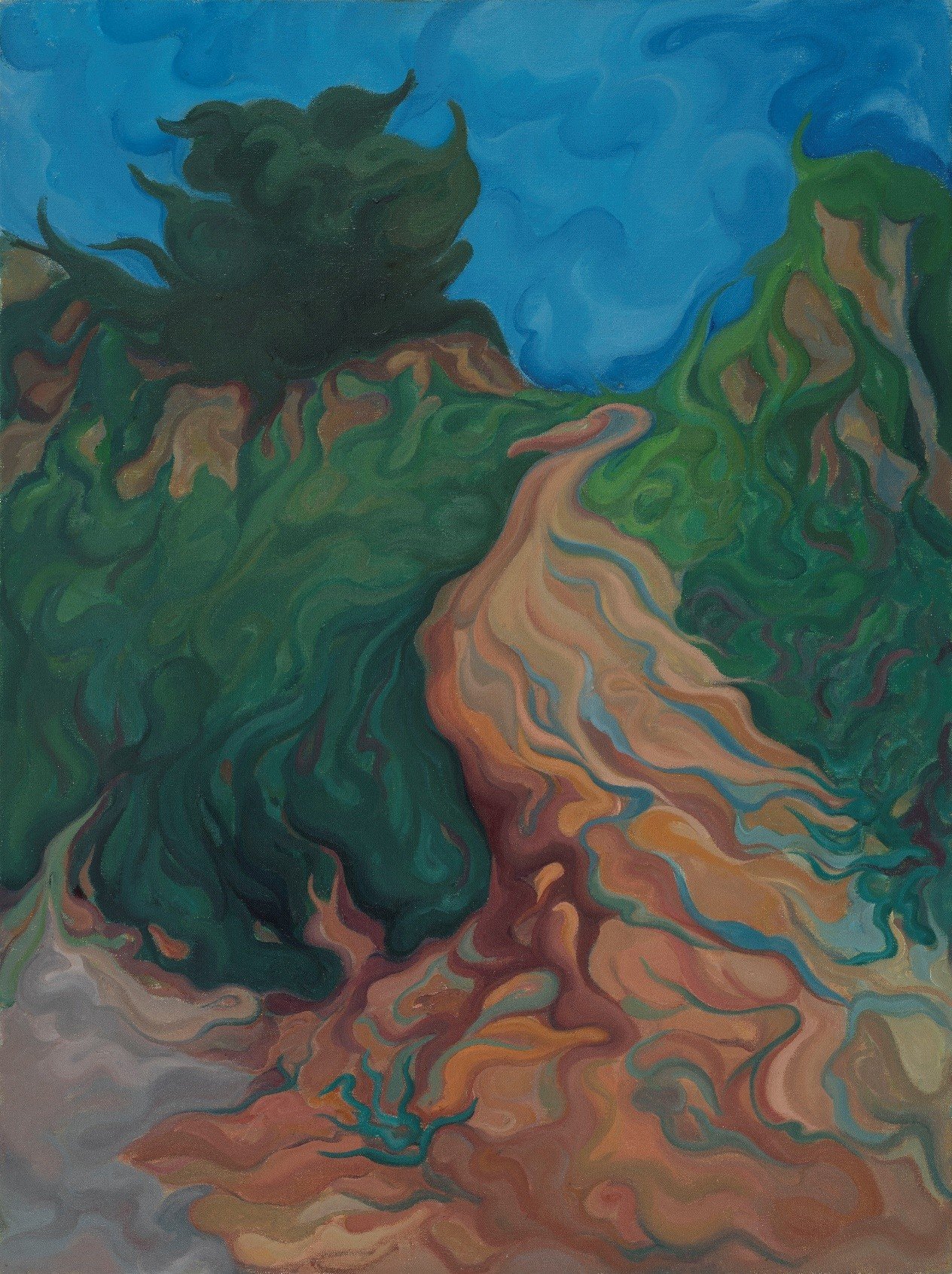 张栋梁这批以风景为意象的系列作品是由三个“根脉”汇聚“生长”的有机整体。其一、源自传统的“生长”。研习中国书法艺术是催生这批作品的灵感萌芽,而梵高的《星空》与塞尚的几何化形式结构和开放空间结构,也成为潜在根系之一。作品将可见可感的自然与内心映射的自然融合再造,以一种“与自然并行不悖”的自在形式呈现“艺术自有一份和谐”(塞尚语)的魅力,其承传与转换,既显而易见又相辅相成。其二、发自内心的“生长”。从某种角度说,艺术是人生存的一种精神探求,这批作品中所葆有的强烈生命意识,是真挚动人的。动感的构图,装饰的造型,绚烂的色彩,寓意的符号,构成了在激烈精神支配下的跳跃和律动,画面既是赞美自然的肺腑之言,更是热爱生命的心灵述说。其三、触碰观念的“生长”。这批作品对具象的舍弃与超越,形式变化的背后必然是观念的演进,不论是表现或写意,还是象征与抽象,其焦点直抵当下人的生存状态和精神内核,抒情诗意的表达方式充满精神的张力。作品中所蕴含的自我反思、自我审视、自我呈现等丰富内涵,是思想碰撞的结晶与文化存在的独白。