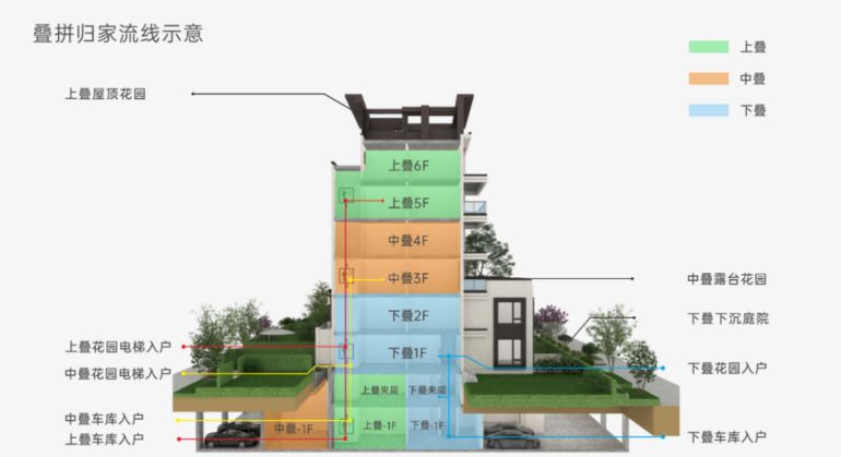目前市场上大部分叠墅产品,都是“高低配”中的配角。大平层+墅式产品的组合在满足不同市场需求保证高去化率的同时,也意味着更高的货值,但不可避免地降低了居住氛围的纯粹性。